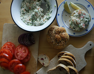 W misce rozgniatamy widelcem twaróg, dodajemy śmietanę oraz siekane szczypior, natkę pietruszki, czosnek i chili. Solimy i dodajemy nieco soku z limonki. Całość łączymy z przestudzonymi krewetkami.