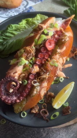 Macki ośmiornicy rozmrażamy, płuczemy w zimnej wodzie, osuszamy. Siekamy dymkę oraz krojone ogórki w plastry. Majonez łączymy z sirachą. Bułki przekrawamy wzdłuż, lekko grillujemy lub smażymy od wewnętrznej strony, natomiast macki smażmy bardzo krótko na dobrze rozgrzanym ojelu lub grilujemy aby były lekko chrupkie, następnie solimy do smaku. Bułki smarujemy sosem układamy plasterki ogórka, a na nich układamy macki, dodając dymkę oraz prażoną cebulkę, ewentulanie pieprz do smaku.