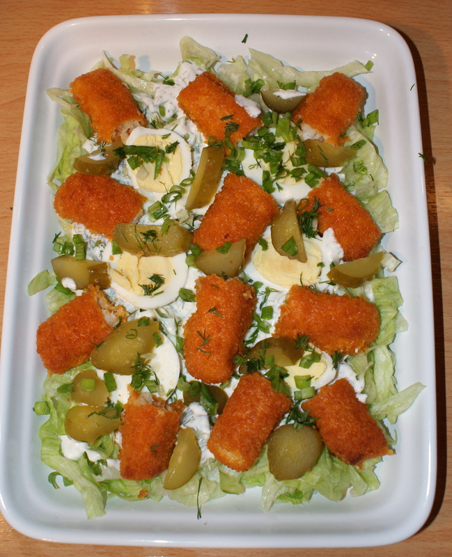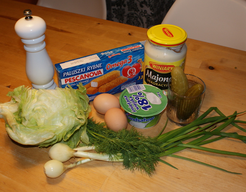 Paluszki rybne podsmażamy na gorącym, dość głębokim oleju. Siekamy sałatę w dowolny sposób. Gotujemy 3 jajka. Kroimy ogórki kiszone na plasterki lub półplasterki. Siekamy drobno szczypior i koperek. Sos sporządzamy w następujący sposób: śmietanę mieszamy z majonezem i musztardą. Solimy, pieprzymy. Dodajemy posiekaną zieleninę, pozostawiamy odrobinę do posypania wierzchu sałatki. Mieszamy dokładnie.