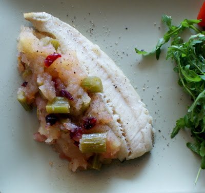 Jabłka myjemy, obieramy, i wrzucamy do rondelka. Podlewamy odrobiną wody. Kulki żurawiny płuczemy i kroimy na połówki. Seler naciowy również myjemy, pozbawiamy pióropuszy liści i kroimy na plasterki. Całość dusimy przez kilka minut, aż jabłka rozpadną się, seler zmieni kolor, a żurawiny puszczą czerwony sok.