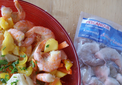 Po zdjęciu z patelni krewetek i warzyw, dorzucamy je do owoców i mieszamy niedbale. Całość skrapiamy obficie sokiem z limonki i delikatnie oprószamy listeczkami kolendry.