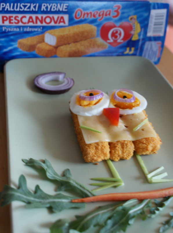 Na początek przygotujmy paluszki rybne wedle wskazówek na opakowaniu. Następnie należy wstawić jajko i gotować około 5 minut. Gotowe paluszki rybne przykrywamy plastrem sera, a za nim z kolei układamy plastry jaja - to będą oczy. Teraz zabierzmy się za warzywa. Sowa siedzi na gałęzi z marchwi i rukoli, więc potrzebujemy obrać marchewkę i wykroić z niej konar. Myjemy rukolę, paprykę i por. Z listków rukoli układamy liście drzewa, z pora wykrawamy drobne paski na nóżki i rączki (hmmm - skrzydełka?) sowy. Z papryki wycinamy trójkąt na dziób. Z cebuli wykrawamy dwa plastry - z jednego będzie zrobiony księżyc, drugi posłuży nam za oprawki okularów sowy-mądrali. Źrenice tradycyjnie robimy z ziarenek pieprzu, a sowią fryzurę z koperku.